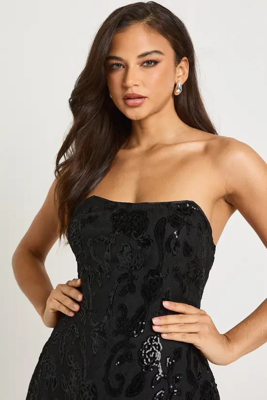 Bandeau Structured Velvet Lace Demask Skater Mini Dress